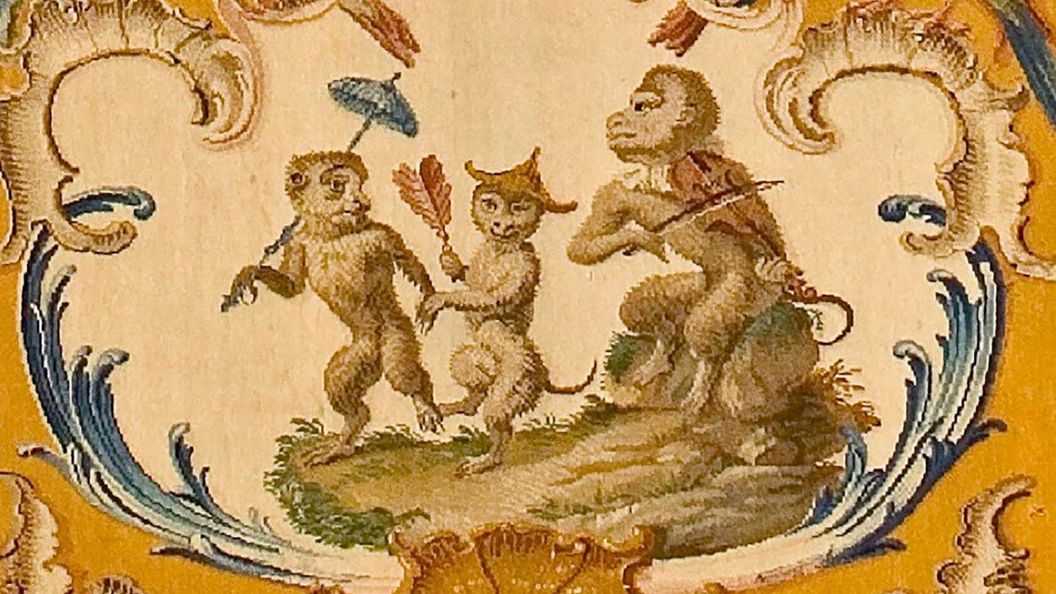 Auf den Savonnerien im Musikzimmer findet sich eines der beliebtesten Motive der Orientmode des 18. Jahrhunderts wieder: die „Singerie“. Das französische Wort wird mit „Affentrick“ übersetzt, und bezeichnet Darstellungen von Affen, die menschliches Verhalten nachahmen. Das Motiv gab es bereits im Alten Ägypten, in der Neuzeit wurde es mit weiteren exotischen Details kombiniert. So tragen die Affen auf den Bruchsaler Knüpfteppichen asiatische Modeartikel wie einen Sonnenschirm oder Hut.
